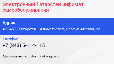 Электронный Татарстан, инфомат самообслуживания по адресу 423453, Татарстан, Альметьевск, Геофизическая, 1в в дальнейшем Организация, размещена в следующих категориях: