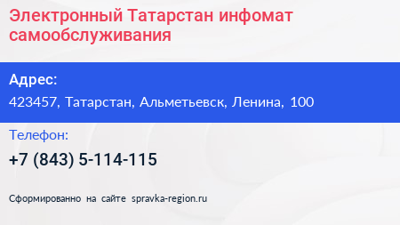 Электронный Татарстан, инфомат самообслуживания по адресу 423457, Татарстан, Альметьевск, Ленина, 100 в дальнейшем Организация, размещена в следующих категориях: