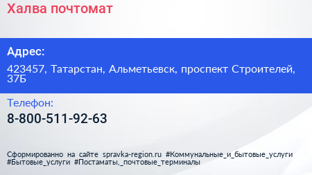 Халва, почтомат по адресу 423457, Татарстан, Альметьевск, проспект Строителей, 37Б в дальнейшем Организация, размещена в следующих категориях:
