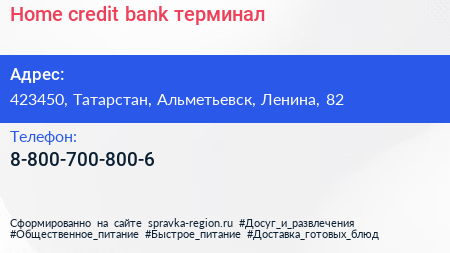 Home credit bank, терминал по адресу 423450, Татарстан, Альметьевск, Ленина, 82 в дальнейшем Организация, размещена в следующих категориях: