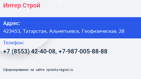 Интер-Строй по адресу 423453, Татарстан, Альметьевск, Геофизическая, 28 в дальнейшем Организация, размещена в следующих категориях: