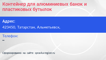 Контейнер для алюминиевых банок и пластиковых бутылок по адресу 423450, Татарстан, Альметьевск, в дальнейшем Организация, размещена в следующих категориях: