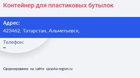 Контейнер для пластиковых бутылок по адресу 423462, Татарстан, Альметьевск, в дальнейшем Организация, размещена в следующих категориях: