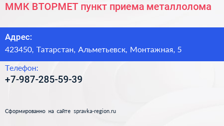 ММК ВТОРМЕТ, пункт приема металлолома по адресу 423450, Татарстан, Альметьевск, Монтажная, 5 в дальнейшем Организация, размещена в следующих категориях: