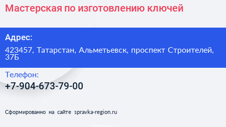 Мастерская по изготовлению ключей по адресу 423457, Татарстан, Альметьевск, проспект Строителей, 37Б в дальнейшем Организация, размещена в следующих категориях: