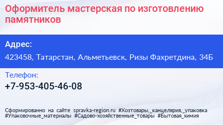 Оформитель, мастерская по изготовлению памятников по адресу 423458, Татарстан, Альметьевск, Ризы Фахретдина, 34Б в дальнейшем Организация, размещена в следующих категориях: