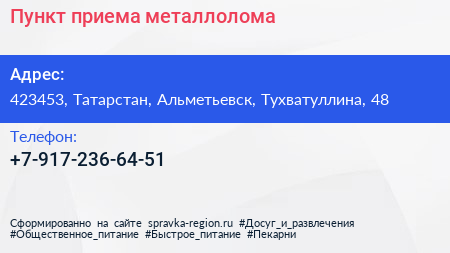 Пункт приема металлолома по адресу 423453, Татарстан, Альметьевск, Тухватуллина, 48 в дальнейшем Организация, размещена в следующих категориях:
