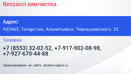 Renzacci, химчистка по адресу 423465, Татарстан, Альметьевск, Чернышевского, 31 в дальнейшем Организация, размещена в следующих категориях: