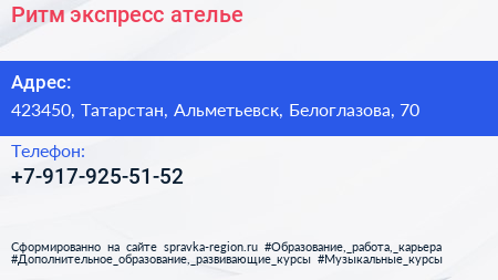 Ритм, экспресс-ателье по адресу 423450, Татарстан, Альметьевск, Белоглазова, 70 в дальнейшем Организация, размещена в следующих категориях: