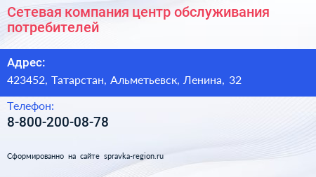 Сетевая компания, центр обслуживания потребителей по адресу 423452, Татарстан, Альметьевск, Ленина, 32 в дальнейшем Организация, размещена в следующих категориях: