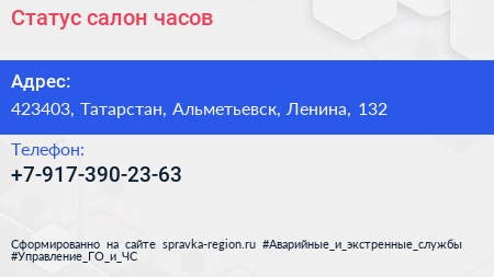 Статус, салон часов по адресу 423403, Татарстан, Альметьевск, Ленина, 132 в дальнейшем Организация, размещена в следующих категориях: