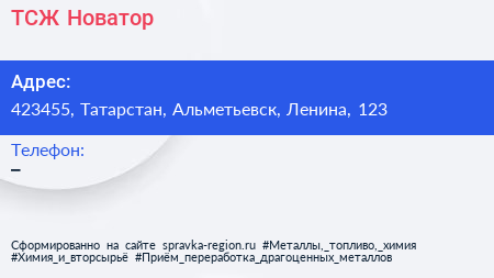 ТСЖ Новатор по адресу 423455, Татарстан, Альметьевск, Ленина, 123 в дальнейшем Организация, размещена в следующих категориях: