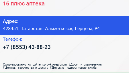 16 плюс, аптека по адресу 423451, Татарстан, Альметьевск, Герцена, 94 в дальнейшем Организация, размещена в следующих категориях: