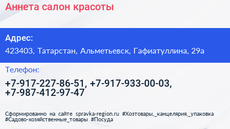 Аннета, салон красоты по адресу 423403, Татарстан, Альметьевск, Гафиатуллина, 29а в дальнейшем Организация, размещена в следующих категориях:
