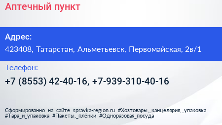 Аптечный пункт по адресу 423408, Татарстан, Альметьевск, Первомайская, 2в/1 в дальнейшем Организация, размещена в следующих категориях: