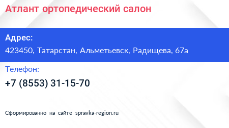 Атлант, ортопедический салон по адресу 423450, Татарстан, Альметьевск, Радищева, 67а в дальнейшем Организация, размещена в следующих категориях: