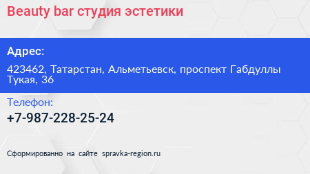 Beauty bar, студия эстетики по адресу 423462, Татарстан, Альметьевск, проспект Габдуллы Тукая, 36 в дальнейшем Организация, размещена в следующих категориях: