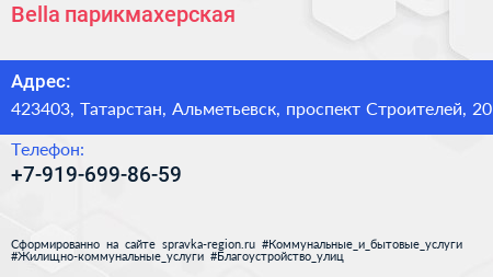 Bella, парикмахерская по адресу 423403, Татарстан, Альметьевск, проспект Строителей, 20 в дальнейшем Организация, размещена в следующих категориях:
