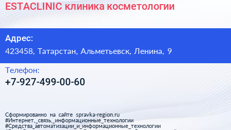 ESTACLINIC, клиника косметологии по адресу 423458, Татарстан, Альметьевск, Ленина, 9 в дальнейшем Организация, размещена в следующих категориях: