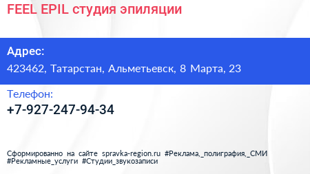 FEEL EPIL, студия эпиляции по адресу 423462, Татарстан, Альметьевск, 8 Марта, 23 в дальнейшем Организация, размещена в следующих категориях: