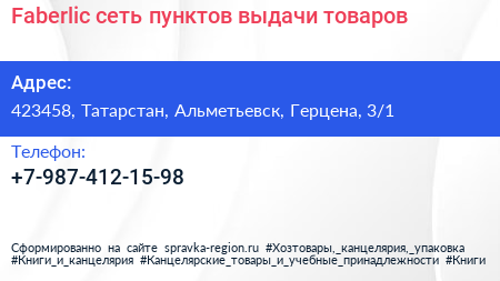 Faberlic, сеть пунктов выдачи товаров по адресу 423458, Татарстан, Альметьевск, Герцена, 3/1 в дальнейшем Организация, размещена в следующих категориях: