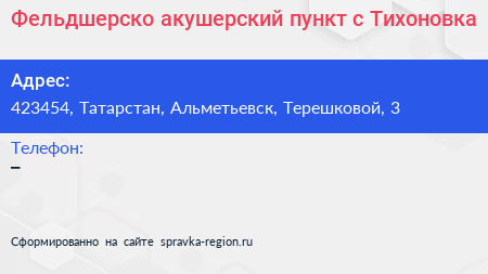 Фельдшерско-акушерский пункт, с. Тихоновка по адресу 423454, Татарстан, Альметьевск, Терешковой, 3 в дальнейшем Организация, размещена в следующих категориях: