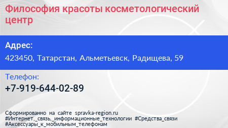 Философия красоты, косметологический центр по адресу 423450, Татарстан, Альметьевск, Радищева, 59 в дальнейшем Организация, размещена в следующих категориях: