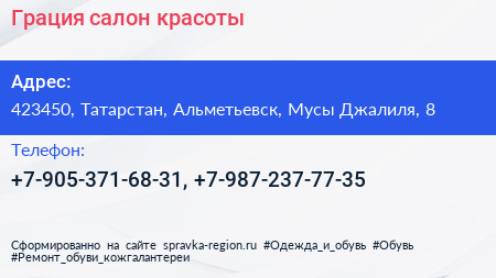 Грация, салон красоты по адресу 423450, Татарстан, Альметьевск, Мусы Джалиля, 8 в дальнейшем Организация, размещена в следующих категориях: