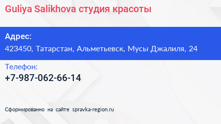 Guliya Salikhova, студия красоты по адресу 423450, Татарстан, Альметьевск, Мусы Джалиля, 24 в дальнейшем Организация, размещена в следующих категориях: