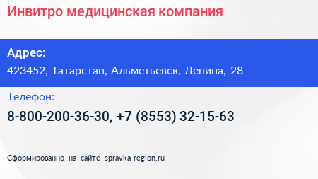 Инвитро, медицинская компания по адресу 423452, Татарстан, Альметьевск, Ленина, 28 в дальнейшем Организация, размещена в следующих категориях: