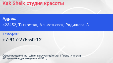Kak Shelk, студия красоты по адресу 423452, Татарстан, Альметьевск, Радищева, 8 в дальнейшем Организация, размещена в следующих категориях: