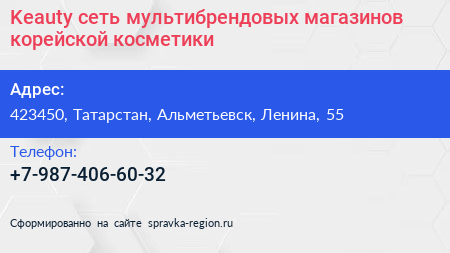 Keauty, сеть мультибрендовых магазинов корейской косметики по адресу 423450, Татарстан, Альметьевск, Ленина, 55 в дальнейшем Организация, размещена в следующих категориях: