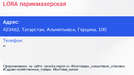 LORA, парикмахерская по адресу 423462, Татарстан, Альметьевск, Герцена, 100 в дальнейшем Организация, размещена в следующих категориях: