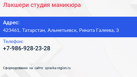 Лакшери, студия маникюра по адресу 423461, Татарстан, Альметьевск, Рината Галеева, 3 в дальнейшем Организация, размещена в следующих категориях: