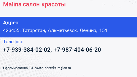 Malina, салон красоты по адресу 423455, Татарстан, Альметьевск, Ленина, 151 в дальнейшем Организация, размещена в следующих категориях: