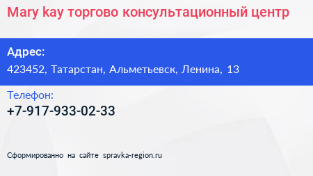 Mary kay, торгово-консультационный центр по адресу 423452, Татарстан, Альметьевск, Ленина, 13 в дальнейшем Организация, размещена в следующих категориях: