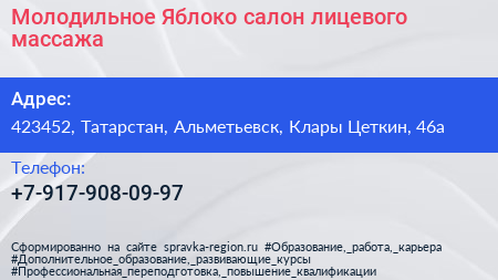Молодильное Яблоко, салон лицевого массажа по адресу 423452, Татарстан, Альметьевск, Клары Цеткин, 46а в дальнейшем Организация, размещена в следующих категориях: