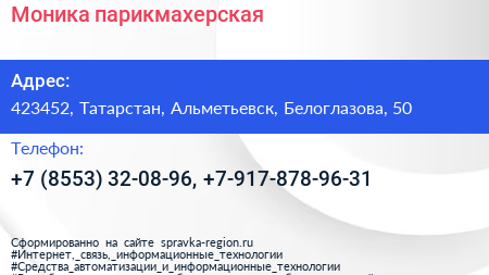 Моника, парикмахерская по адресу 423452, Татарстан, Альметьевск, Белоглазова, 50 в дальнейшем Организация, размещена в следующих категориях: