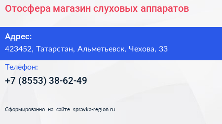Отосфера, магазин слуховых аппаратов по адресу 423452, Татарстан, Альметьевск, Чехова, 33 в дальнейшем Организация, размещена в следующих категориях: