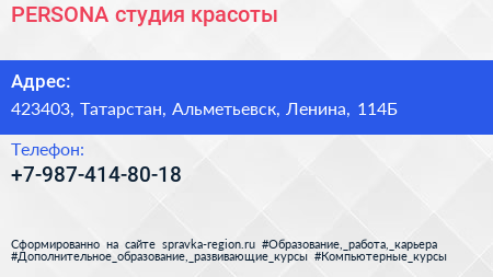 PERSONA, студия красоты по адресу 423403, Татарстан, Альметьевск, Ленина, 114Б в дальнейшем Организация, размещена в следующих категориях:
