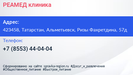 РЕАМЕД, клиника по адресу 423458, Татарстан, Альметьевск, Ризы Фахретдина, 57д в дальнейшем Организация, размещена в следующих категориях: