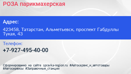 РОЗА, парикмахерская по адресу 423458, Татарстан, Альметьевск, проспект Габдуллы Тукая, 43 в дальнейшем Организация, размещена в следующих категориях:
