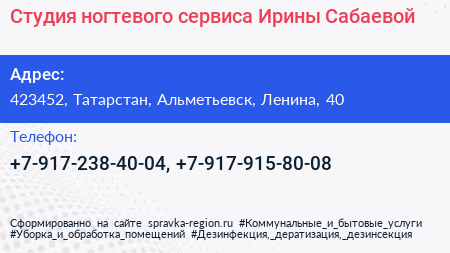 Студия ногтевого сервиса Ирины Сабаевой по адресу 423452, Татарстан, Альметьевск, Ленина, 40 в дальнейшем Организация, размещена в следующих категориях: