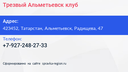Трезвый Альметьевск, клуб по адресу 423452, Татарстан, Альметьевск, Радищева, 47 в дальнейшем Организация, размещена в следующих категориях: