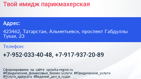 Твой имидж, парикмахерская по адресу 423462, Татарстан, Альметьевск, проспект Габдуллы Тукая, 23 в дальнейшем Организация, размещена в следующих категориях: