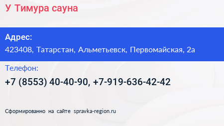 У Тимура, сауна по адресу 423408, Татарстан, Альметьевск, Первомайская, 2а в дальнейшем Организация, размещена в следующих категориях: