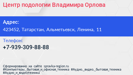 Центр подологии Владимира Орлова по адресу 423452, Татарстан, Альметьевск, Ленина, 11 в дальнейшем Организация, размещена в следующих категориях: