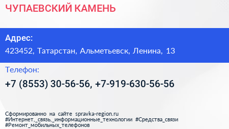 ЧУПАЕВСКИЙ КАМЕНЬ по адресу 423452, Татарстан, Альметьевск, Ленина, 13 в дальнейшем Организация, размещена в следующих категориях: