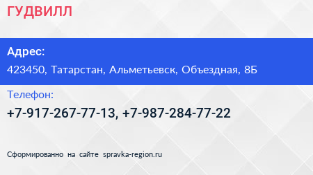 ГУДВИЛЛ по адресу 423450, Татарстан, Альметьевск, Объездная, 8Б в дальнейшем Организация, размещена в следующих категориях: