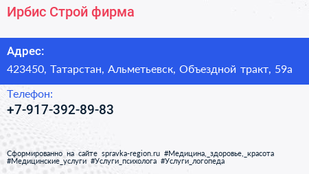 Ирбис-Строй, фирма по адресу 423450, Татарстан, Альметьевск, Объездной тракт, 59а в дальнейшем Организация, размещена в следующих категориях: